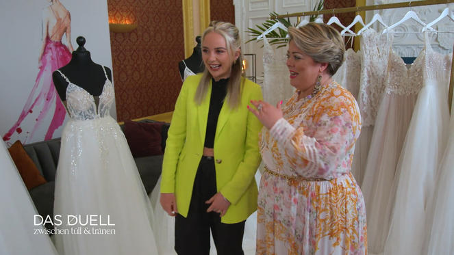 Braut Mona ist Metzgerin. Das ist nicht die einzige Besonderheit bei diesem Duell: Ihr gesuchtes Kleid muss auch noch Traktor-kompatibel sein. Ihr schwebt eine funkelnde A-Linie oder eine Prinzessin vor. Der Duell-erfahrene Hannes Schrader und die Newcomerin Mirja Menze-Buss stellen sich dieser Aufgabe. Die Traktortauglichkeit wird dabei noch zu einem echten Problem.