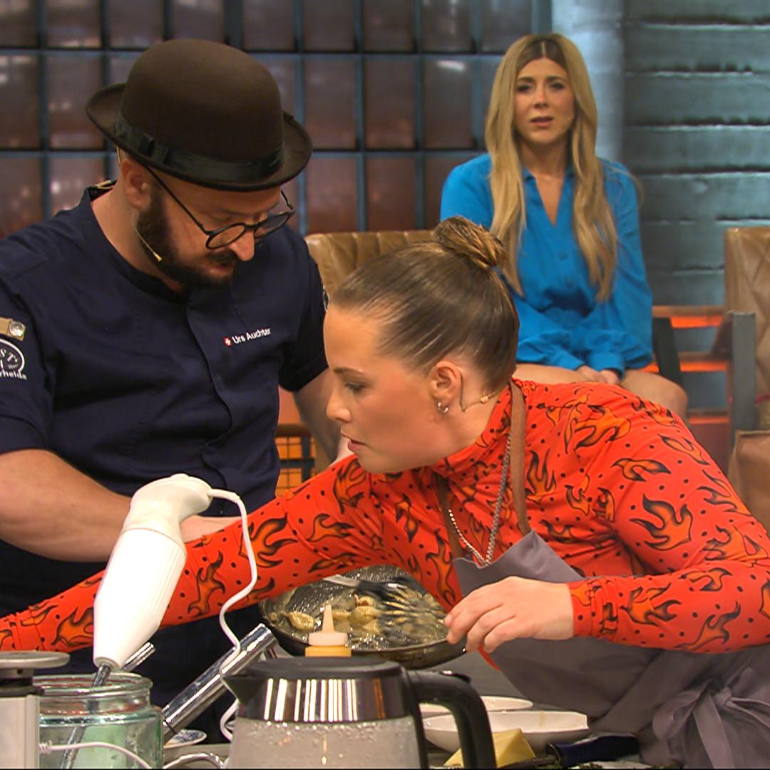 Nach dem kleinen Verzähler beim Spielstand hat Laura ein ganz besonders aufmerksames Auge auf die Teams. Sie bemerkt zum Beispiel, dass beide Teams Grünkohl frittieren - eine eher ungewöhnliche Vorgehensweise bei der Zubereitung. Doch Steffen bleibt weiter frech: "Warste wieder die ganze Woche feiern?"